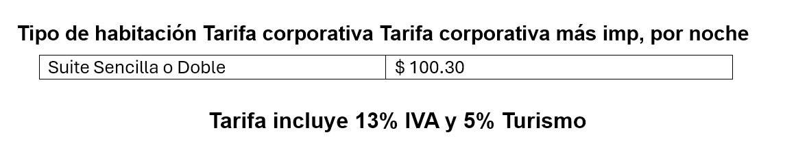 Nota Importante: Favor tomar nota que su tarifa tiene un cupo definido dentro del inventario de habitaciones. En días de alta ocupación es posible no encuentre disponibilidad de su tarifa negociada por lo que se ofrecerá la tarifa más económica disponible para las fechas de su estadía. Tarifas sujetas a cambio.